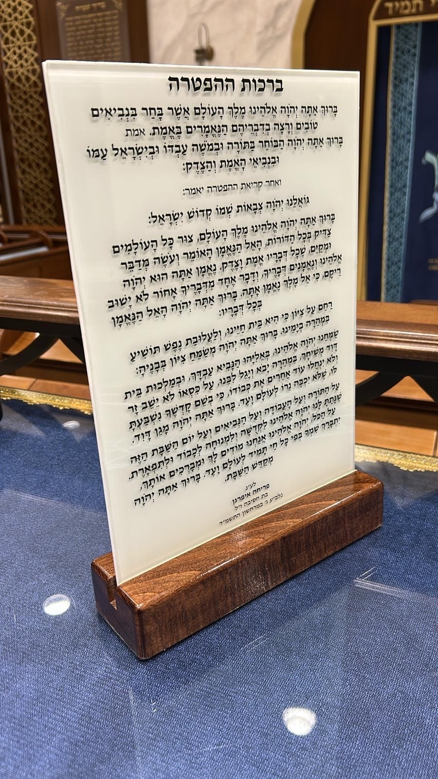 ברכת אשר יצר מהודר בחריטה על זכוכיתלוחות תורמים על לוחות שקופיםבריך שמיה בחריטה על זכוכית מושב רתמיםברכות התורה בהדפסה על זכוכיתתפילה לשלום המדינה